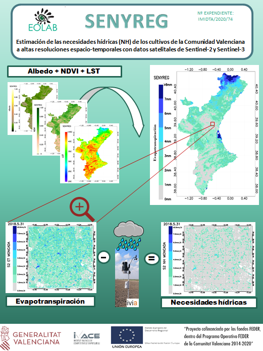 SENYREG is based on the estimation of the water needs (NH), evapotranspiration (ET) and Land Surface Temperature (LST) at median resolution (300m) over Comunidad Valenciana using Sentinel-3 and at high resolution (10/20m) over some fileds (Moncada and Requena-Utiel) using Sentinel-2. It was co-financed by the Valencian Insitute of Business Competitiveness (IVACE) with FEDER funds from the European Union.